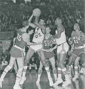 The semifinal game against Morris Harvey College was a real battle, with the Ravens holding off the Eagles for a 73-70 win. Again, DeGreeff led the way with 26 points, but Jones pulled down 20 rebounds and Glore’s one-on-one defense shut down Harvey’s star player, Roger Hart. Protecting a one-point lead, the Ravens were working the clock with less than a minute to go when DeGreeff was intentionally fouled. More than 10,000 fans held their breath as he made both free throws to give the Ravens a 3-point margin and cement the victory.